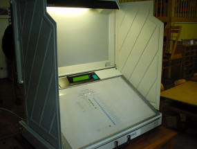 Wahlcomputer (heute nicht mehr im Einsatz!), es wird wieder per Wahlzettel gewählt